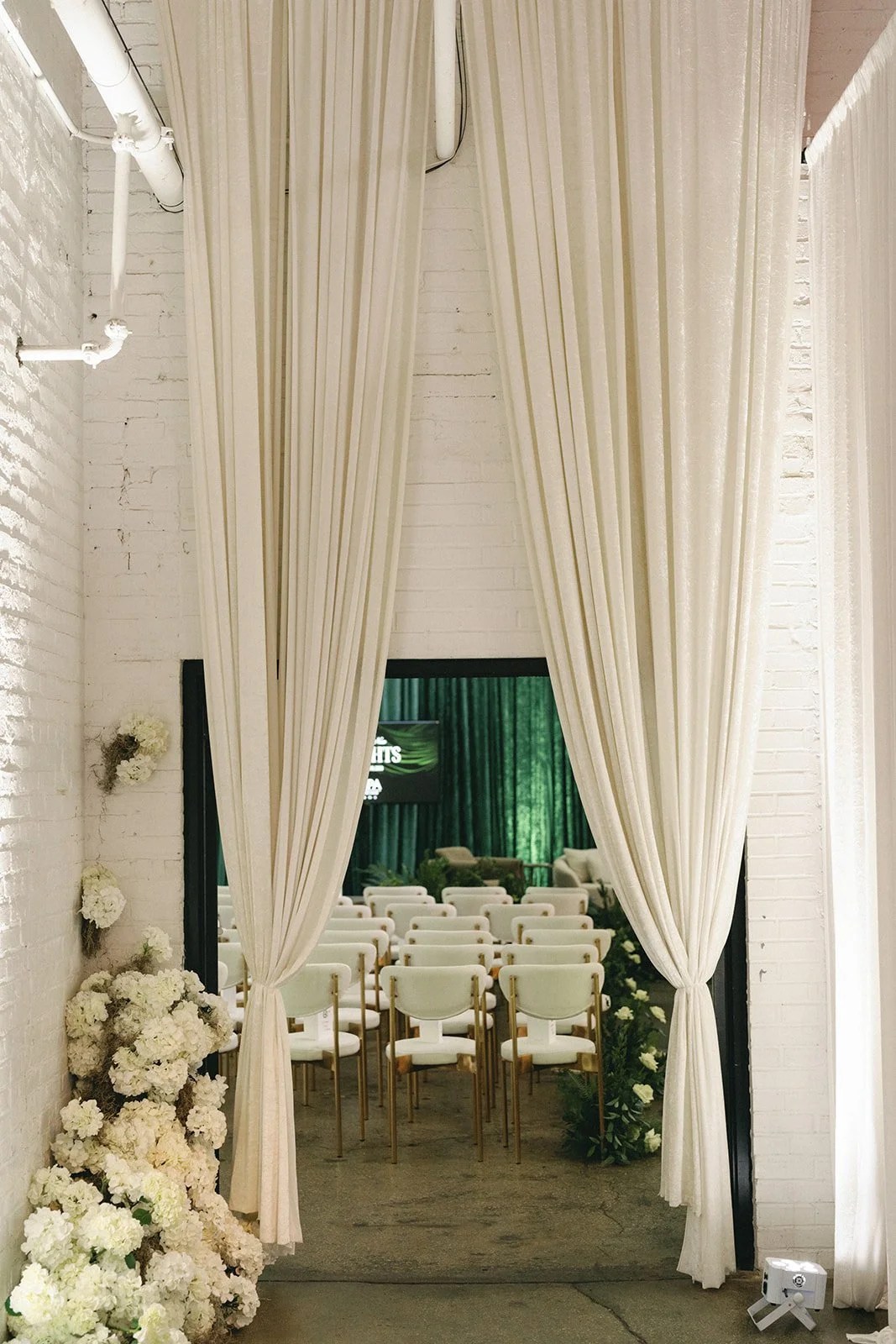 Make a grand first impression with us! We specialize in creating breathtaking entrance and entryway drapery that sets the tone for your wedding or event. Our elegant, custom-designed fabric installations add a touch of luxury and enchantment, ensuring your guests are welcomed into a truly memorable celebration.